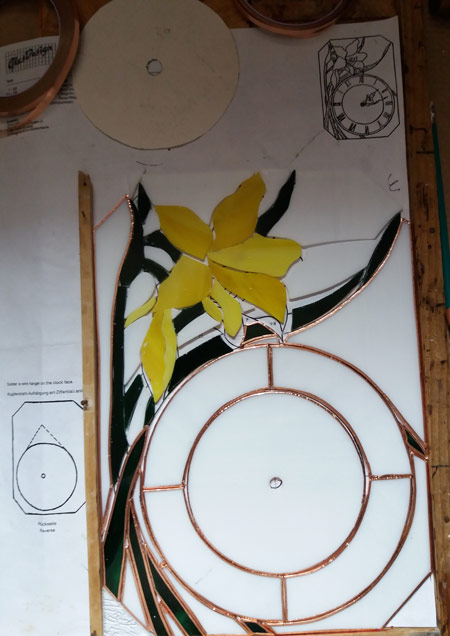 Sárga virágos tiffany óra, ajándékba készült, a megrendelő egy orvosnak szánta.